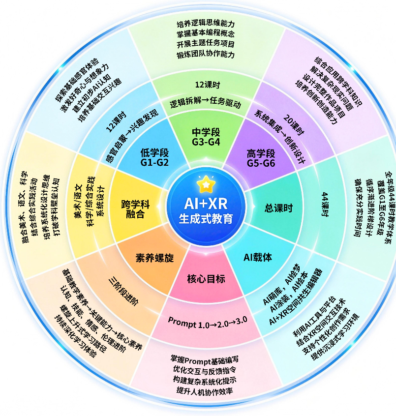 破解这一难题,需要的不只是一节课,而是一套能将思维成长贯穿始终的课程体系。博乐信息以“AI生成内容为创意源头、XR沉浸空间为成果载体”,推出AI+XR生成式教育课程,将提示词工程作为思维训练的核心载体,构建起三阶递进的训练路径。